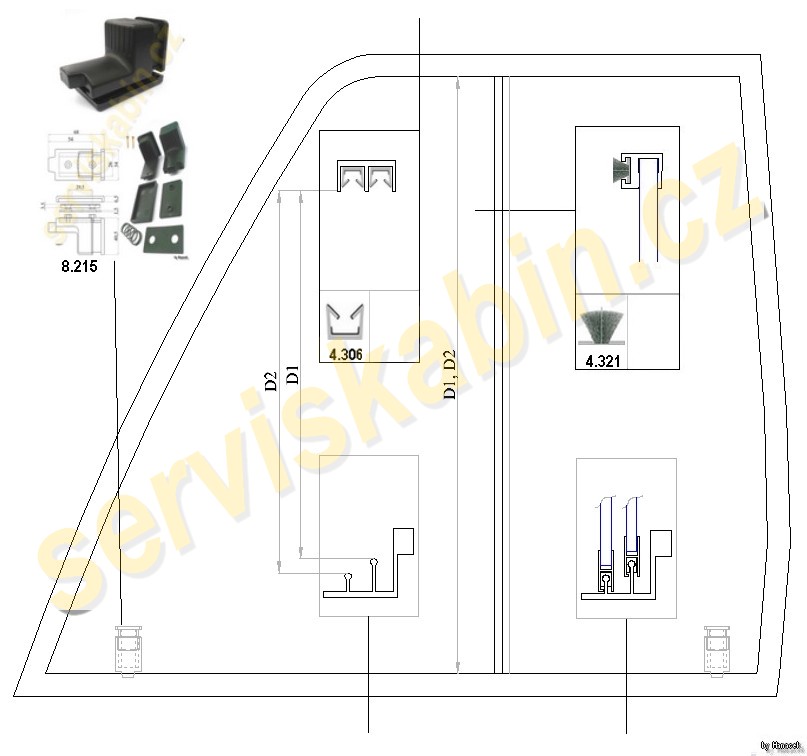 Další hliníkový systém německého výrobce jenž se vyznačuje nelehkostí nahradit rozbité sklo, tyto profily využívá výrobce Fritzmeier, který tyto rámy lepí na dveře a tudíž se vyznačují nejednoduchou rozebiratelností. Ukotvení posuvných skel na spodní vodící lištu není zrovna nejkvalitnější (nekvalitní zalisování vodících prvků na začátku a konci vodící lišty) a tudíž se může přihodit, že skla jednoduše z tohoto profilu vypadnou.....oprava je kupodivu velmi jednoduchá a zcela dostupná, tedy pokud se sklo nerozbilo již.